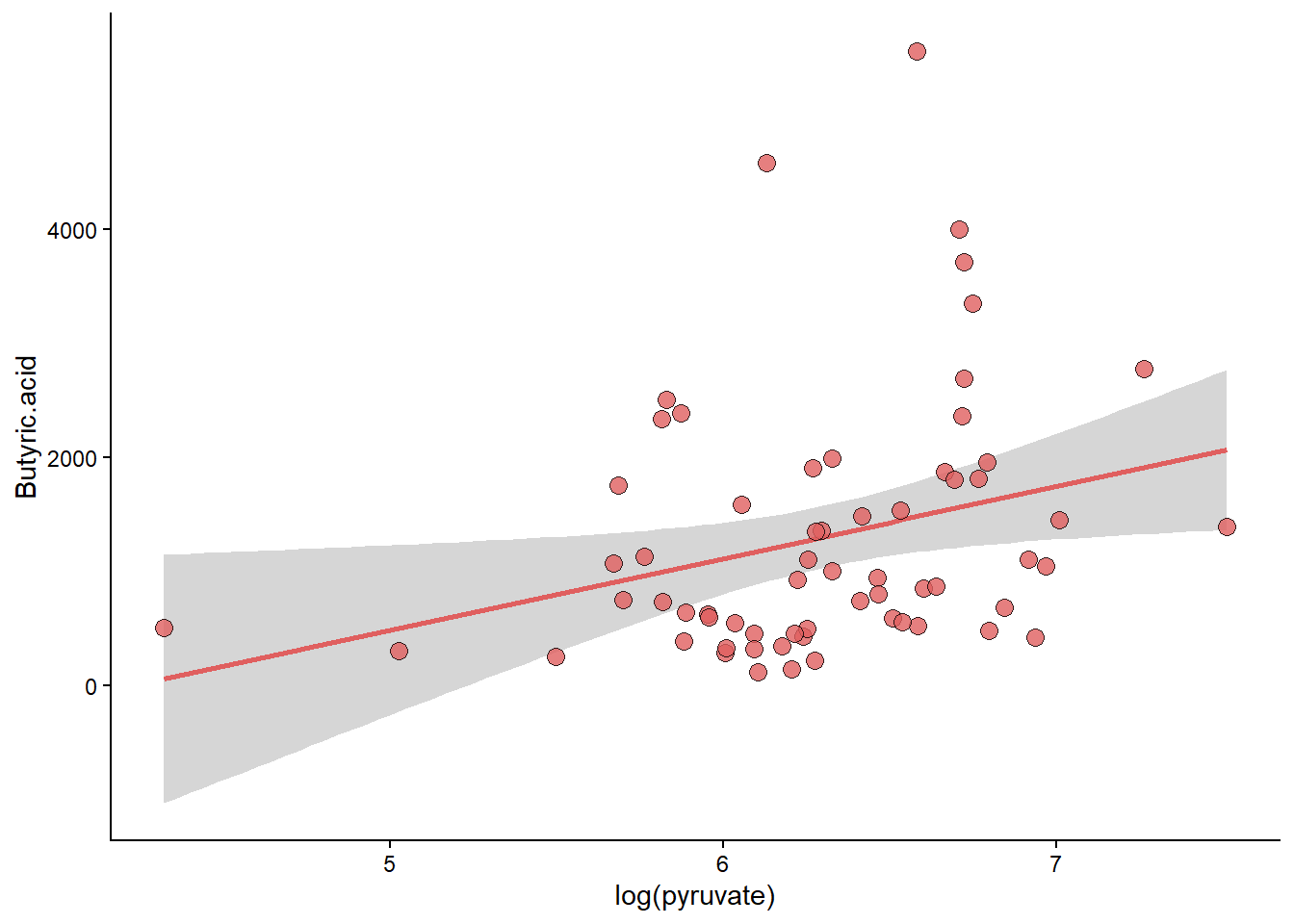 geom_smooth(aes(x=log(pyruvate), y=Butyric.acid), method=lm, color="#e05f5f") +